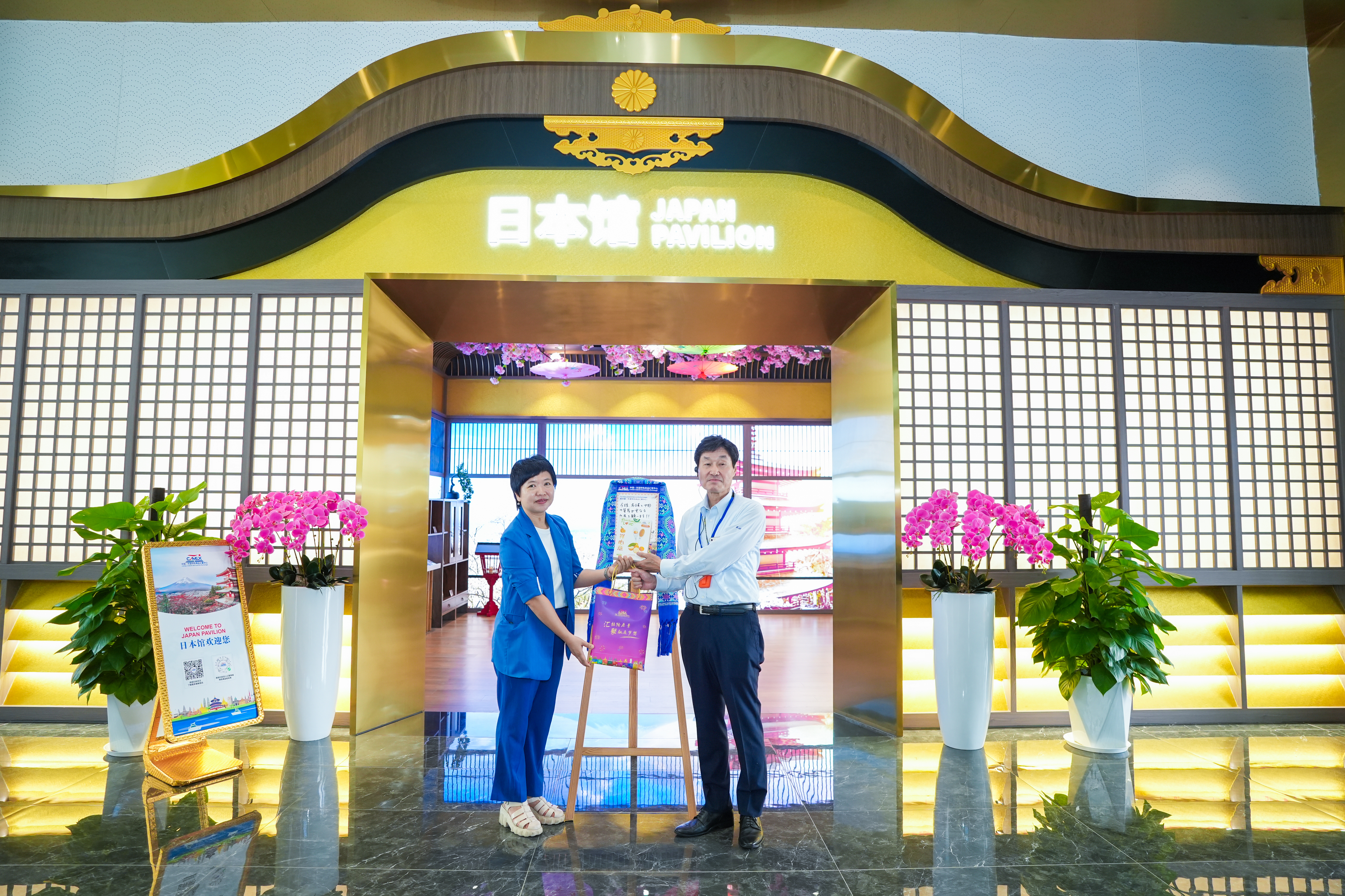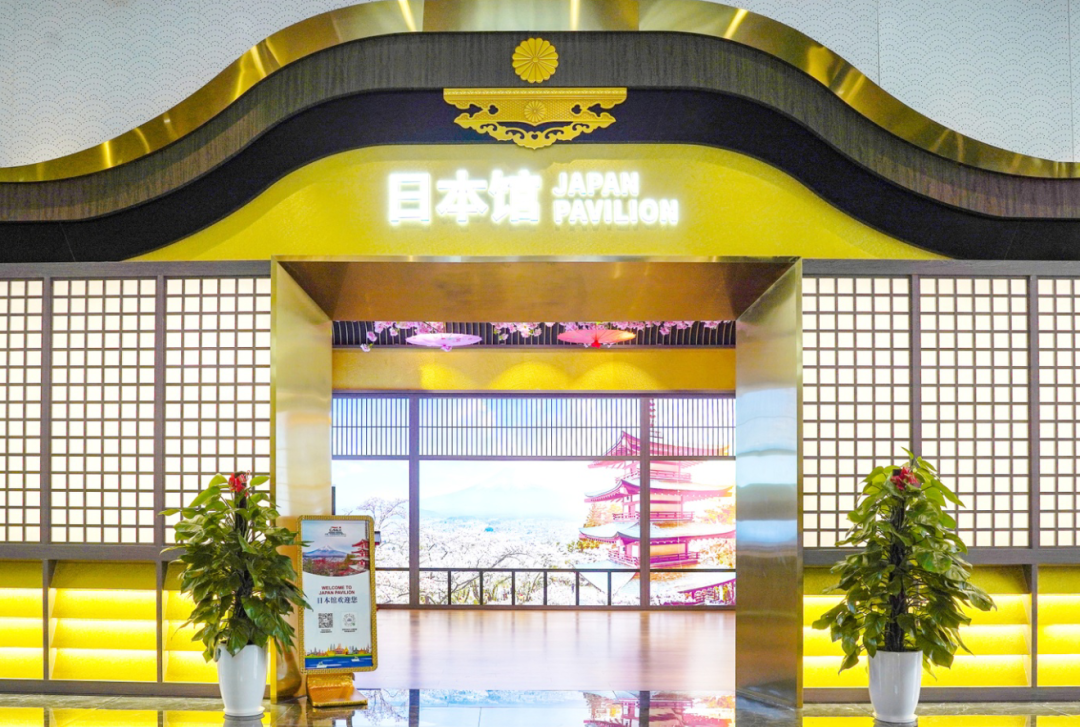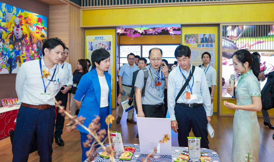 來(lái)到日本館,濃郁的日式風(fēng)情瞬間吸引了訪(fǎng)華團的注意。作為匯聚中心的特色主題館之一,日本館以"春夏秋冬"為設計主線(xiàn),讓訪(fǎng)客在有限的空間內沉浸式感受日本文化的獨特魅力。大家相繼用鏡頭記錄下獨具特色的場(chǎng)景布置,并對館內陳列的各類(lèi)特色商品表現出極大興趣,不時(shí)駐足了解相關(guān)內容。